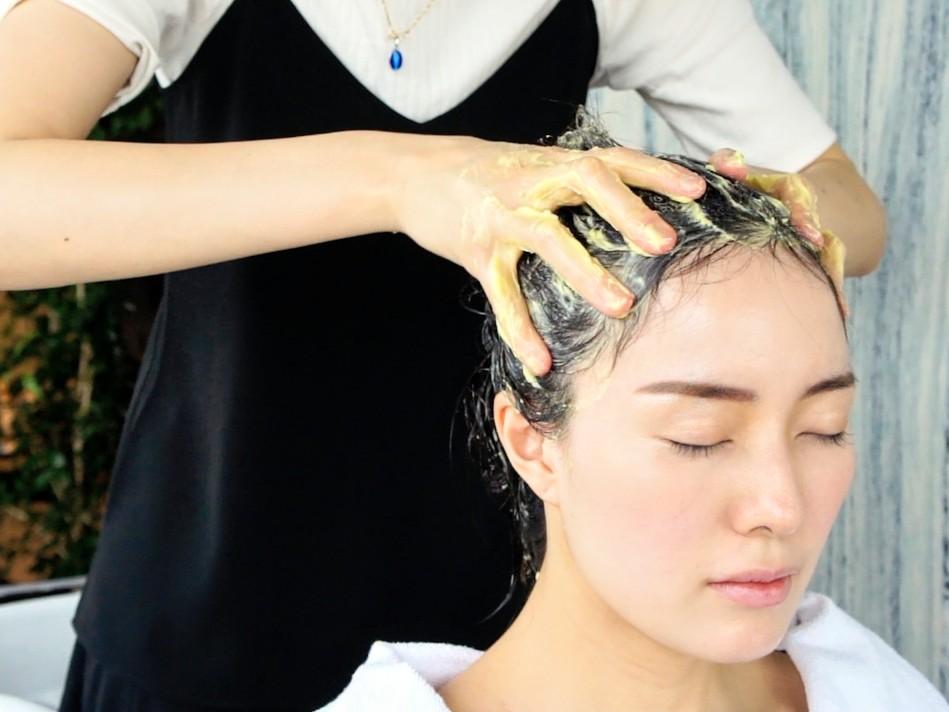 【顧客様用】ハーブやフルーツ等の天然植物成分が凝縮されたトリートメントをたっぷりとつけてのバリ式ヘッドスパ。眼のお疲れが気になる方にもおすすめ。セルフブロー。別途ロング代有。