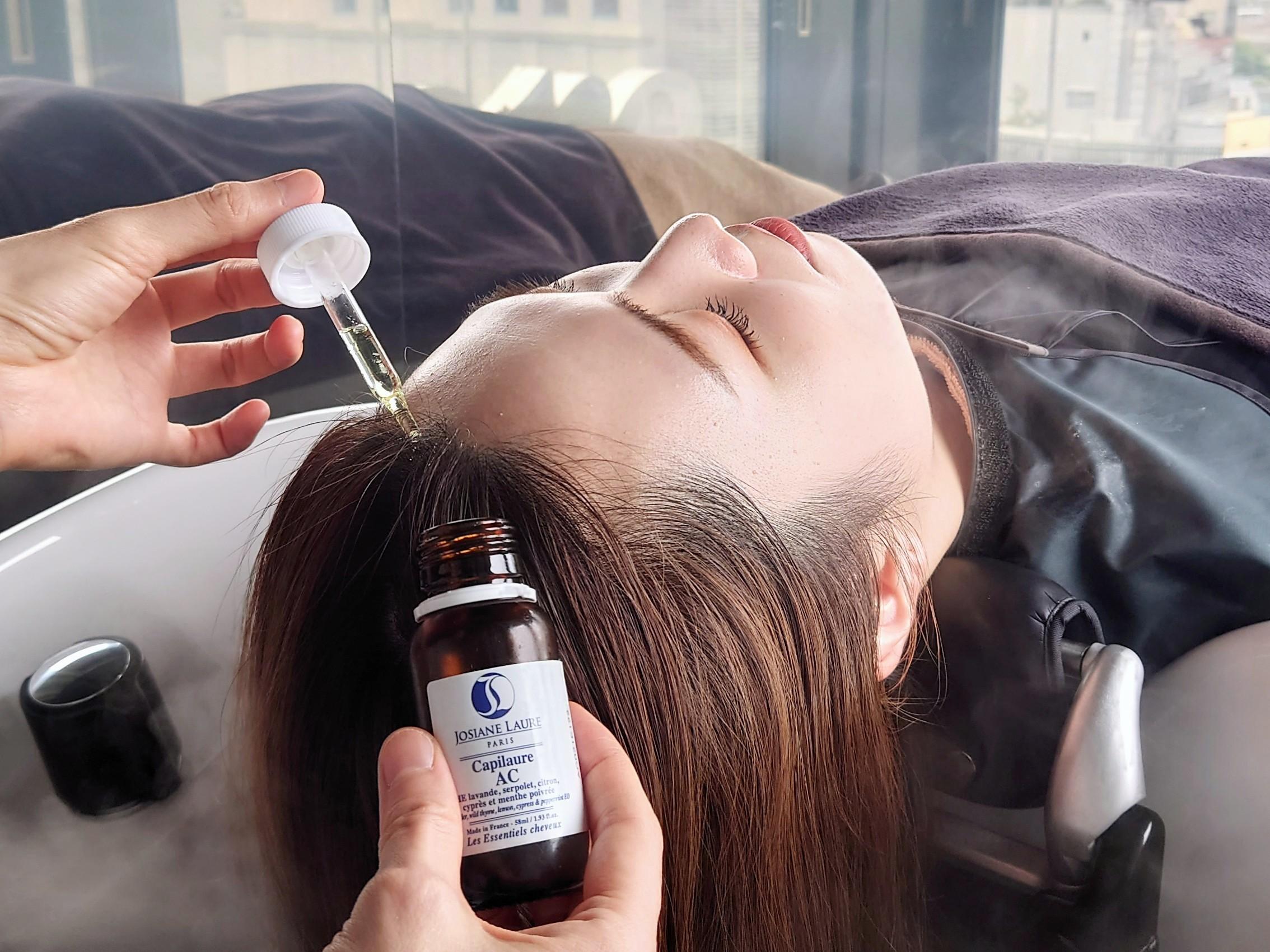 【顧客様用】ダイアナ妃も愛用した最高級ブランドを贅沢にフル使用し、心地よいアロマの香りに癒されながら、頭・首・肩のまでのケアが。セルフブロー。別途ロング代有。頭浸浴との組み合わせも◎